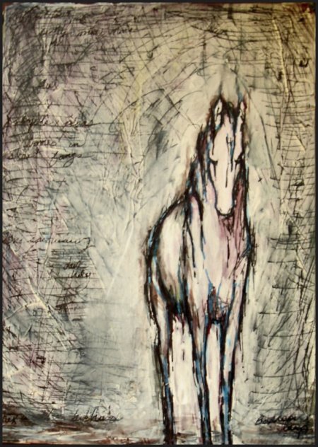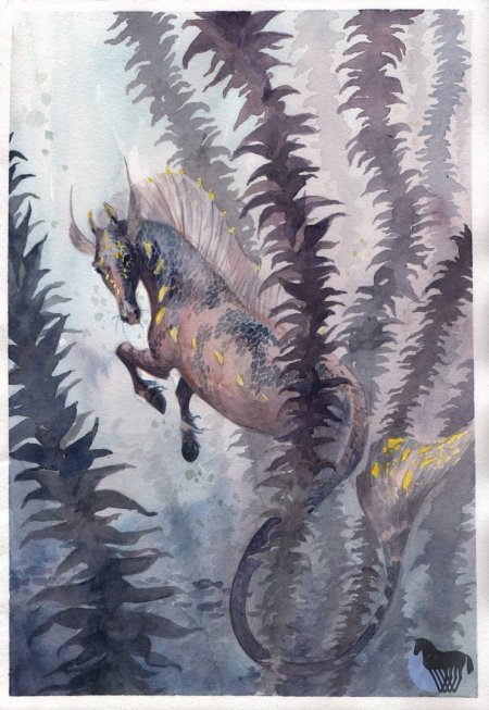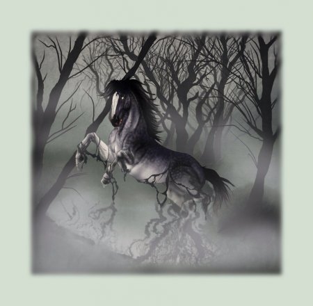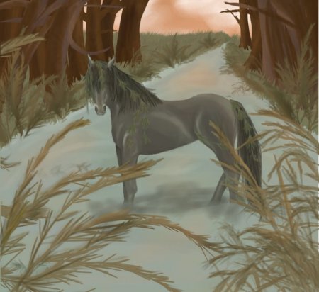 Свеча и лампа погасли, но девочка осторожно развела огонь в очаге, и увидела, что под темными кудрями незнакомца прячутся тонкие и острые лошадиные уши. Тотчас же она поняла, что ее гость - страшный Глаштин, который в любой момент может превратиться в коня и утащить ее в море. Девочка сидела тихо, как мышь, что было нелегко, а ночь все тянулась и тянулась. Вдруг уголек треснул в очаге, и незнакомец проснулся. Он сел, вынул из кармана жемчужное ожерелье и принялся покачивать им перед глазами девочки, приглашая ее отправиться с ним. Она оттолкнула ожерелье, и тогда Глаштин ухватил ее за платье. Она громко закричала, и от ее крика маленький петушок, сидевший на потолочной балке, проснулся и прокукарекал. Глаштин бросился вон, и девочка услышала удаляющийся цокот конских копыт по камням.