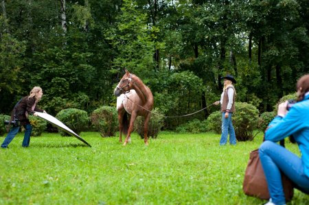 Выбираем место съемок. К этому подходим очень внимательно. Возможно, местность будет как-то подчеркивать породу лошади(например, кабардинский конь весьма уместно будет смотреться на фоне гор, а орловский рысак около колежной тележки, стоящей на ипподроме). Затем готовим его, возможно, вы захотите добавить какой-то интерьер или предметы конного спорта, а вообще здесь вашу фантазию никто не ограничивает. Далее устанавливаем аппаратуру, если, конечно, у вас она имеется. Лучше всего, если ваша фотосессия будет проходить в погожий солнечный день, поверьте, вряд ли вы ограничетесь десятью минутами.