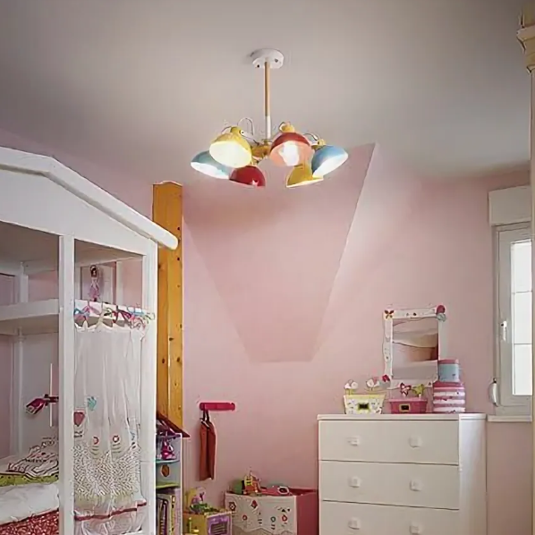 Чтобы ребенок не ранил себя осколками стекла, из этого материала люстру или светильник лучше не подбирать. В детской будут уместны плафоны из пластика или ткани. Главное, чтобы светильник хорошо освещал всю комнату.