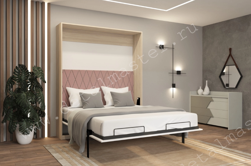 Поднятая вертикально постель помещается в комод, при надобности образует спальное место с ортопедическим матрасом. Откидная кровать-трансформер горизонтальная располагается по длине стенки, примыкая к ней боковой частью.