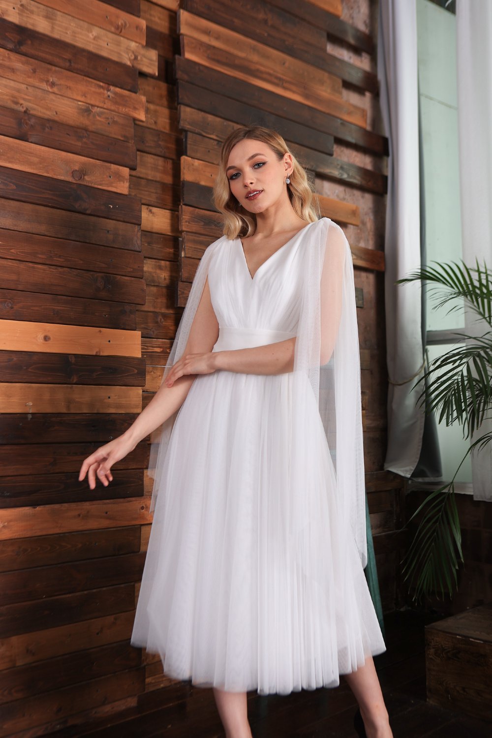 - “Чайные”. Эти наряды можно узнать по длине юбки, она ниже линии колен, однако, несколько выше щиколотки. На пике популярности сейчас находятся чайные платья, в которых верх выполнен из достаточно плотной ткани, а низ – из максимально легкой, воздушной, струящейся;