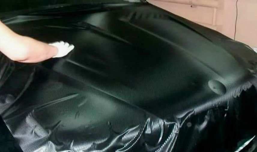На большие детали (капот, крыша) лучше работать вдвоём. Это обеспечит точность и исключит складки.