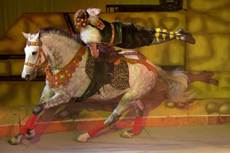 Динамику и грацию этому повествованию придает такое великолепное животное как лошадь, ставшее человеку верным и преданным спутником на все времена. Также эффектности шоу придают захватывающие трюки актеров и живая музыка, точнее барабаны и флейта.