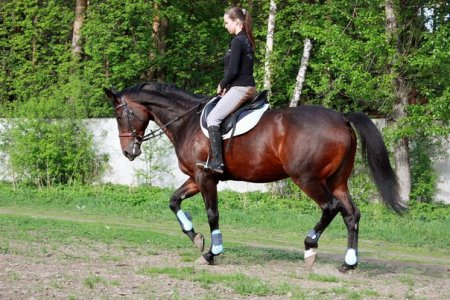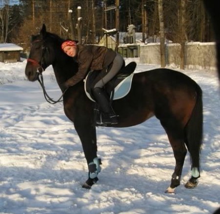 Кобылка Прелесть - крупная ганноверская кобыла, тёмно-гнедая с сединой на мордочке, 1996 года рождения.