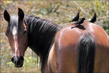 Второе место присуждается птицам. Лошади позволяют им есть с одной кормушки с ними, птицы могут склевывать с лошадей клещей и так же они поедают назойливых мух. Кроме того, лошади боятся ос. Оса не подлетит к лошади, если рядом будет хотя бы воробей. Лошади не относятся к птицам с агрессией. Разве что птицы часто бояться их.