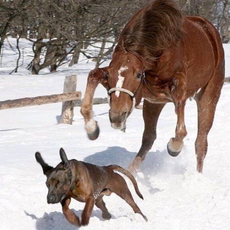 Третье место присуждается собакам. Именно третье, поскольку собаки часто пугают своим лаем лошадей. Но есть и исключения. Молодые кони или жеребята могут играть вместе с собакой в поле, при этом она не причинит ему вреда. Конечно, с такой дружбой нужно быть обходительным. Нельзя забывать, что собака может по-доброму укусить лошадь, но лошадь распознает это как угрозу.
