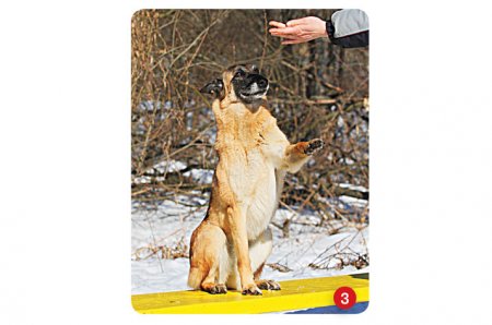 На этом этапе мы начинаем выпрямлять корпус. Показываем животному правую руку, даем команду и ждем. Если питомец сразу поднял нужную лапу, пытаясь дотянуться до руки, поощряем его голосом и кусочком лакомства. Если же эта задача для собаки пока еще сложна, можно немного наклониться к ней и опустить руку чуть ниже, таким образом «подсказывая» нужное решение. Замечу: в том случае, если предыдущие этапы отработаны правильно, трудностей при обучении возникнуть не должно. И больших, и маленьких собак на данном этапе я рекомендую сажать на край скамейки или на какое-либо возвышение. Это делается для того, чтобы пес во время подачи лап оставался на одном месте и не пытался давать их, подойдя вплотную к хендлеру.