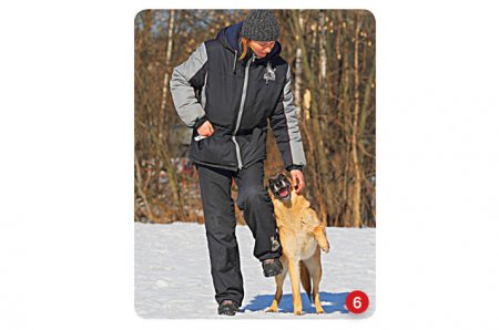 Когда я вижу, что пес уверенно дает лапы, сидя у левой ноги, я ставлю его и сразу ввожу команду «Шаг!». Обычно собака, хорошо освоившая этапы 1–5, с движением «испанским шагом» у левой ноги справляется без труда.