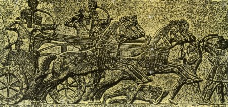 Историки считают, что первые колесницы появились 2300 году до н.э., но пока существенных доказательств, этому нет. И если рассматривать рельефы, то может оказаться впечатление, что в колесницу были впряжены не лошади вообще, а ослы. Такое предположение вполне имеет право на жизнь, поскольку первые лошади, которые были похожи на современных, появились только во втором тысячелетии до нашей эры. Но уже ассирийские воины использовали у себя в колесницах лошадей, рост которых достигал 160 см, и весом 500 кг.