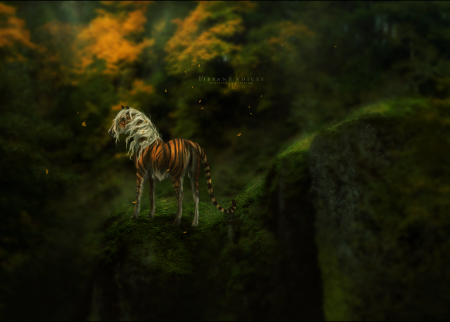 Лошадь-тигр (англ. Tigerhorse) - это лошадь с тигриным окрасом. Олицетворяет хрупкость, красоту. Среда обитания лошади-тигра - Альпы. Тайна и судьба этих необыкновенных лошадей еще не разгадана, так как нашли их лишь в 2000-ом году. Одни люди считают, что у них есть рог, что у них раздвоенные копыта, хвост, как у жирафа и короткая грива. Другие же утверждают, что они больше похожи на обыкновенную лошадь с льняной гривой и тигриным окрасом. Зачастую лошадь-тигр питается плодами, листьями, травой. По жизни это добрая лошадь, но иногда впадает в агрессию. Живой эту лошадь еще никто из обычных людей не видел, люди смогли увидеть только мертвую тушу, а на нем - след от когтей. Люди подумали, что это след беркута. Так и есть - беркут - главный враг лошади-тигра. Это было проверено и высказано перед всем миром учеными.