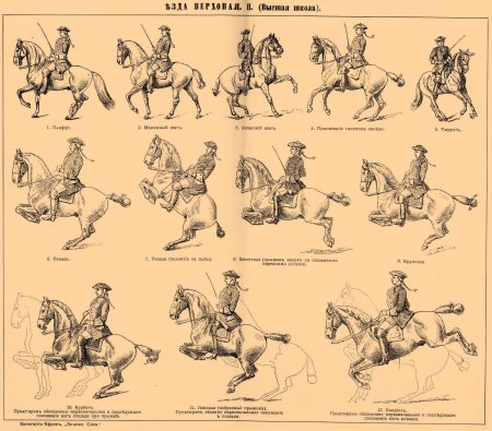 Каприоль. Этот прыжок часто называют оленьим. На каприоли лошадь поднимается на пезаду, стремительно и сильно отталкивается от земли вверх и вперед. Это самый эффектный и в то же время самый трудный по исполнению школьный прыжок. Выполнить каприоль под силу лишь сильной, хорошо сложенной лошади, имеющей природную легкость движений, спокойный и в то же время энергичный характер и, самое главное, способность к школьным прыжкам. Лошадь в пилярах заставляют подняться сначала на высокую пезаду, а затем на баллотаду или круппаду (некоторые лошади переходят в каприоль уже из пезады). Уловив момент начала опускания, тренер резким ударом по крупу заставляет лошадь лягнуть задними догами, причем, подчеркиваем, очень важно проделать это именно в момент опускания, в противном случае лошадь сделает только прыжок вперед и каприоль не получится. И процессе работы в пилярах на лошадь сажают легкого, крепко сидящего в седле всадника, сочетают посыл бичом, голосом и шенкелем. В дальнейшем лошадь работает вне пиляр — под всадником и без него, на лонже. Помощник при этом находится позади на безопасном расстоянии и держит лонжу высоко и слегка натянутой. В момент, когда всадник вышлет лошадь на каприоль, помощник щелкает бичом, чтобы лошадь отбивала задними ногами. После того как лошадь начнет стабильно и без сопротивления исполнять каприоль на лонже, можно перейти к работе без нее. Первое время помощник, находясь позади с хлыстом, готов прийти в случае необходимости на помощь всаднику.
