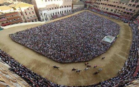 Сиена же представляет собой необычной красоты город ( недаром Сиену считают одним из красивейших городов Токсаны ), где все дороги ведут к главной площади Кампо. Именно эта площадь становится дважды в год ( 2 июля и 16 августа ) в арену для самого сумасшедшего, зрелищного, азартного и священного для тосканцев средневекового состязания - конного Палио в Сиене. Историки полагают, что скачки в этом городе в качестве основного действа стали проводиться в честь больших праздников уже с 1310 г. В XVI в. горожане увлеклись корридой, а после ее запрета Фердинандом I Медичи в 1590 г. сиенские скачки снова вышли на первый план. Они проводились на Пьяцца дель Кампо. Сначала это были скачки на ослах, потом – на буйволах. После нескольких серьезных увечий в 1650 г. были запрещены и они.