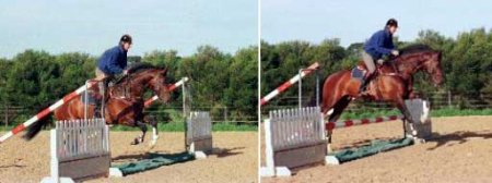 Для того, чтобы нерешительная лошадь прошла маршрут до конца без проблем, всадник должен быть очень компетентен, а его воздействия эффективными. Лошадь должна отвечать всаднику на все воздействия. Использовать нужно все - голос, ногу, хлыст в той мере, которая необходима для обеспечения желаемого импульса продвижения. Большинство ошибок на проблемных препятствиях возникает от того, что осторожные лошади, подходя к ним, начинают терять импульс. В результате прыжок получается неуклюжим, и если в качестве проблемного препятствия выступают брусья, лошади часто приземляются прямо на заднюю жердь. Вы постоянно с облегчением вздыхаете, если избегаете остановки, ведь за две закидки Вас исключат из соревнований. Если такие закидки происходят, значит всадник на лошади действует недостаточно эффективно для поддержания импульса, а лошадь недостаточно тренирована на проблемных препятствиях. Много талантливых лошадей навсегда сыпятся на этой стадии становления. До тех пор, пока всадник не будет в состоянии обеспечить достаточный импульс при доходе лошади на прыжках, высота препятствий должна сохраняться очень малой.
