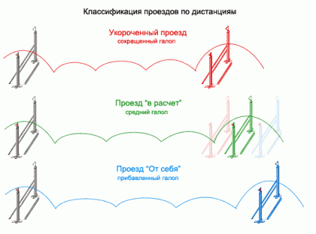 Самая простая классификация проездов строится на количестве темпов галопа, необходимых для прохождения связки. Это, соответственно, проезды в 3,4,5,6,7 темпов галопа. При более длинных дистанциях понятие проезда теряется, и тактически барьеры интерпретируются как отдельные. Характер передвижения между ними становится очень вариативным от лошади к лошади и неподдающимся подведению под общий шаблон.