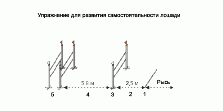 Есть большой смысл в прыжках с рыси последовательности препятствий (п.3 и п.5), а не одиночного препятствия п.3. Быстро следующий после первого, тем более широтный прыжок учит лошадь самостоятельно оставаться собранной (не путать со сбором) после преодоления препятствия (в частности первого чухонца).