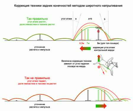 Более гибкий подход – это создание условий, при которых лошадь сама себя наказывает неправильной работой. Если прыгать широтное препятствие с недостаточной инерцией, то задние ноги и круп будут «насаживаться» на заднюю жердь. Избегая столкновения, лошадь будет вынуждена на приземлении работать по классической схеме прыжка – т.е. разгибать спину и «отстреливать» ноги.