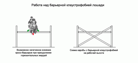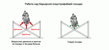 Если Вы заметите, то запас, создаваемый лошадью при преодолении кросс-препятствия значительно больше, чем при прыжках через горизонтальные жерди. Это и есть проявление барьерной клаустрофобии. Если лошадь желает оставить запас в полметра под ногами, то и от корпуса она желает оставить не меньший и даже больший запас.