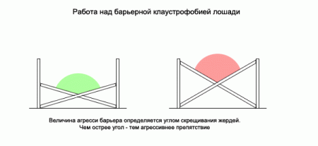 Угол между скрещенными жердями имеет принципиальное значение. Если работы над клаустрофобией можно сравнить с «психологическим душем тела», то угол скрещивания – с температурой струи. Изменять градус надо постепенно, оценивая и дожидаясь максимальной усадки лошади в менее агрессивных крестах. Чем острее угол – тем психологически сложнее лошади.