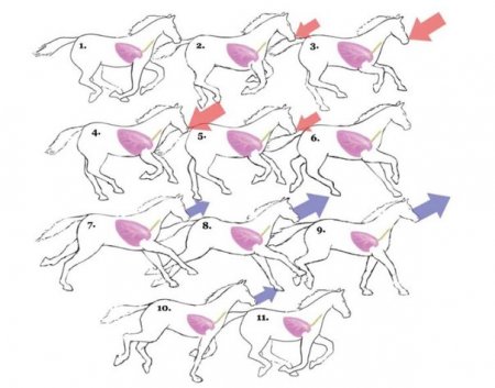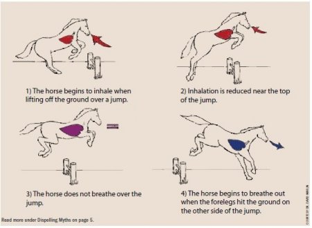 Дыхание – один из самых важных процессов в организме. Для спортсмена оно ещё и тем важно, что сильно влияет на результаты. Лошадь – это тоже атлет, каждый темп галопа она делает одно дыхательное движение. В отличие от других аллюров, где вдох и выдох не сцеплены с фазой движения, на галопе дыхание и движение соединены в единую симфонию. Начало вдоха совпадает с началом темпа. Процесс выдоха происходит при касании земли передними копытами. Поэтому существуют прямая зависимость между широтой маха на галопе и дыханием лошади.