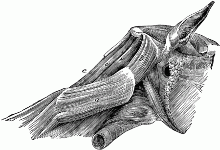 Первый пласт: трапециевидная мышца располагается непосредственно под кожей в области шеи и холки. Тонкая, пластинчатая, имеет форму разностороннего треугольника, который своим основанием к дорсальной средней линии, а вершиной к ости лопатки. Плечеголовная мышца - широкая, пластинчатая, располагающаяся на боковой поверхности шеи вдоль нижней ее половины.