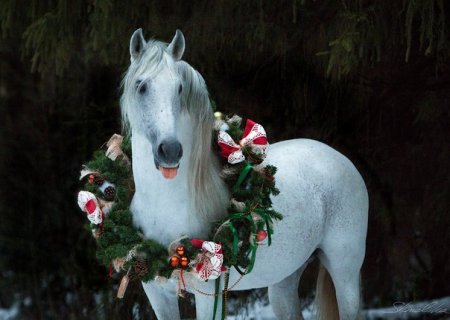Все мы ждем подарки Деда Мороза, который наверняка порадует какой-нибудь интересной вещичкой! Естественно, можно и лошади подарить какой-нибудь сюрприз: например, принести «салат» из моркови и яблок, сшить любимцу вязаную шапочку на уши или просто поиграть со скакуном в леваде!